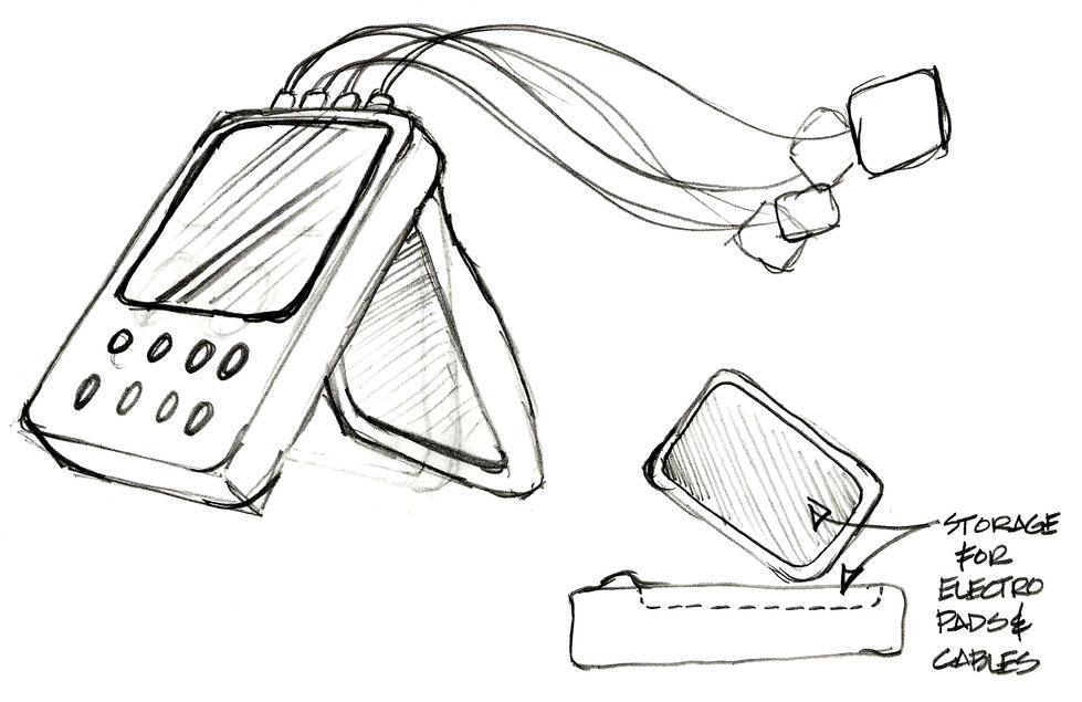 An array of product design preliminary and final sketches using pen and marker on paper.